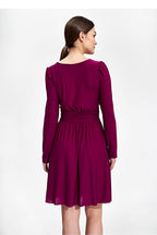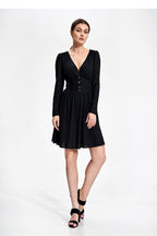 A knee-length flared dress in stretch fabric. Large sweetheart neckline, long sleeves. Draped belt with decorative buttons. Dress without lining and fastening.
