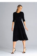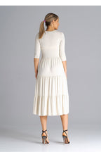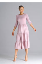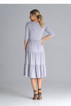 Midi dress with 3/4 sleeves, fitted at the waist. From the waist down three crinkled ruffles. Dress worn over the head.